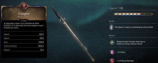 This spear is a great weapon that you buy in Vinland. Sadly, it stays in Vinland otherwise, this spear would have been higher on the list for its good speed and perk to deal more heavy damage after a dodge. It is the best weapon you can use in Vinland, perfect for hunting Vinland’s legendary beast.