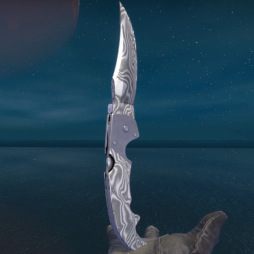The Damascus Steel is made of two different types of steel, creating two shades of gray. Unlike some knives, the falchion has a clipped blade with curved edges. Originally, it was much larger (as a sword), weighing 1-2 pounds and used to slice an opponent or cut off their limbs. In-game, it is drawn by unfolding the blade from the handle. The inspection animation shows the player spinning the blade or balancing the knife on the palm of his hand.