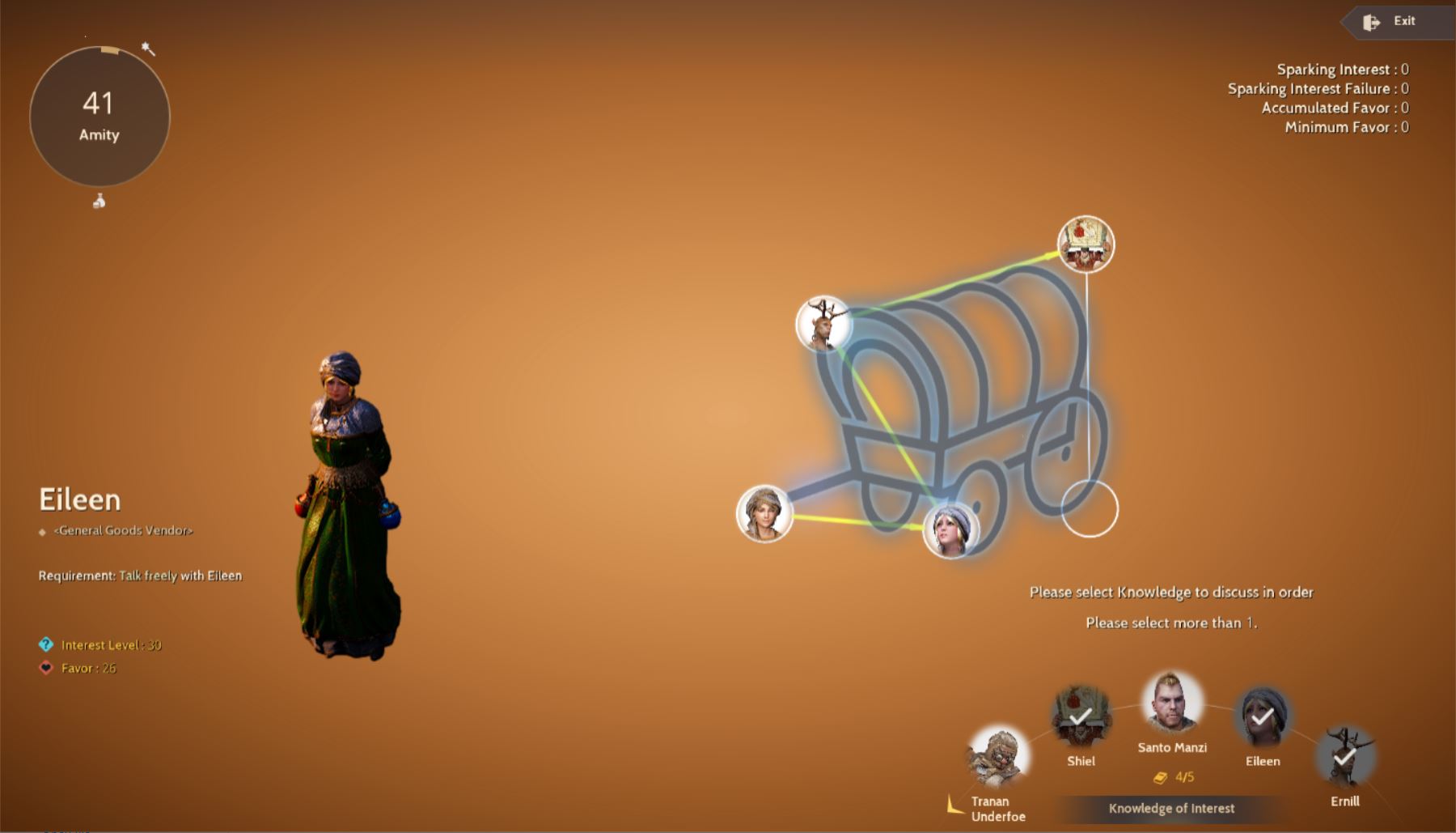 If you click on the “Conversation” tab when you’re interacting with an NPC, it will bring you to a “Mini-game” of sorts wherein the game asks you to pick other NPCs to talk about. The more options and knowledge you have, the better chances of the NPC you are talking to spark a certain interest which results in Amity points which is usually indicated by a smiling blue face for success and a gray sad face for a failed attempt. Finding the right combination of knowledge is what makes you win the so-called mini-game as it would yield more Amity points compared to having failed attempts.