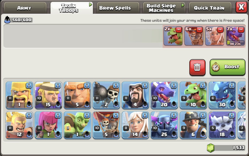 - Clan Castle: x7 Hog Riders, x1 Poison Spell, x1 Earthquake Spell and x1 Siege Barracks
