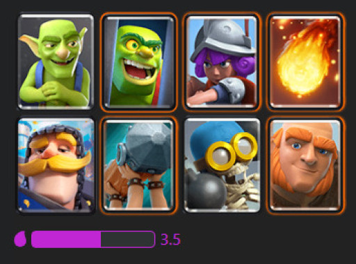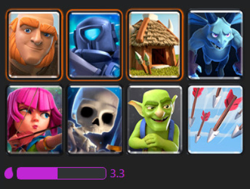 Another great deck using Giant, this deck is a swarm menace that can easily out cycle Arrows. Most players in Barbarian Bowl tend to save their Fireball for heavier troops such as Musketeer or for buildings such as Goblin Hut or Cannon. Because of this, your only real threat is going to be Arrows but because of how much spam you have, if you use your elixir accordingly, you can spawn wave after wave to easily overwhelm the enemy.