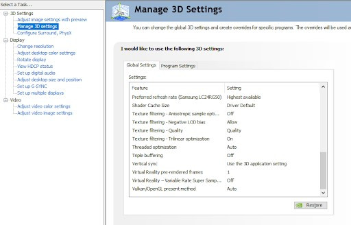 - In the 3D settings section, scroll down to the bottom of the list under “Global Settings”