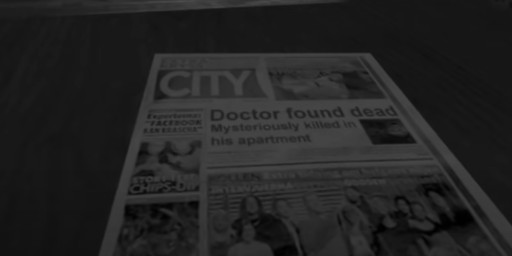 In this first one as in the other three endings, we have Simon in his wheelchair with his head blown to bits dumped on a table, with his book, which at each end has something different written. And on the other side there is a newspaper that in its first story tells us about a doctor who has been mysteriously murdered in his apartment.