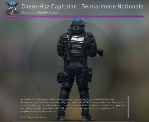 Covered in camo green, this agent appears fully loaded with a gas mask/tank, a swat vest, army boots, and plenty of pockets. He may be slightly harder to spot thanks to his dark camouflage colors. Personally, I like the dark orange transparent visor that tell you green isn't his only favorite color. The gas tank is also a nice touch if you can spot it from time to time (in third person).