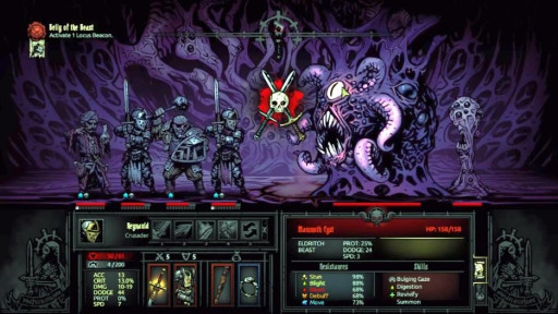 The parasite on this eldritch beast is the first boss in the Darkest Dungeon. He will spawn with a Priest present and will bring in new enemies once you eliminate that Priest. As his name indicates, he will shuffle your party around and also do massive stress damage.