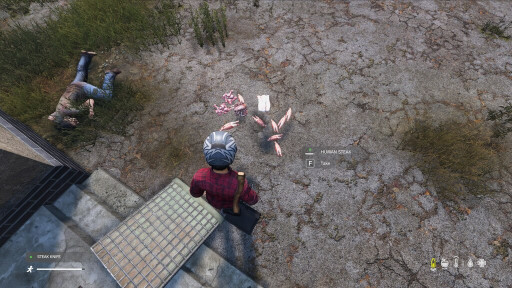 You didn’t have an easy start, the server hasn’t been resettled in quite a long and most of the coastline was already pillaged to the ground, besides that it’s been raining for hours and you became sick. You hear a bunch of people arguing and ending in a shootout, you peak over a window and you see it - a tasty corpse. You walk up to it and drool over it, you pull out your knife and skin the corpse. You loot the meat and run into the woods, start a fireplace and deprive yourself of humanity.