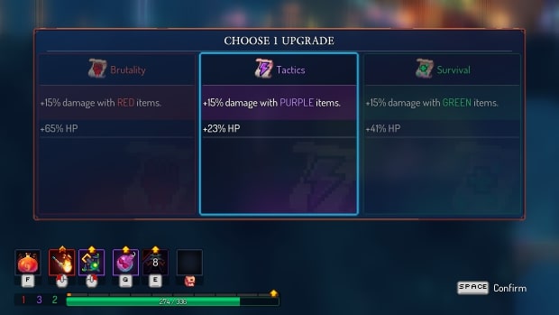 There are other doors at the end of each biome. The hitless doors. These bastards require you to kill either 30 or 60 enemies to open and bring you the same awesome gear that hides behind the timed doors. For this route, time is not of the essence, allowing you to take out enemies slowly and methodically.