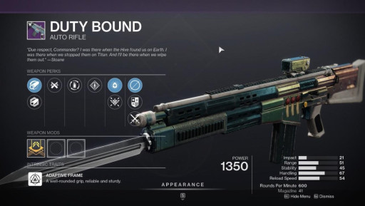 An auto rifle that likes to get to the point, Duty Bound recently got the Nightfall treatment in Destiny 2. Originally from Taken King, this weapon has come back to us with a slew of untraditional options.