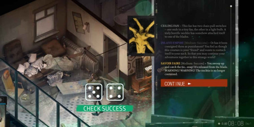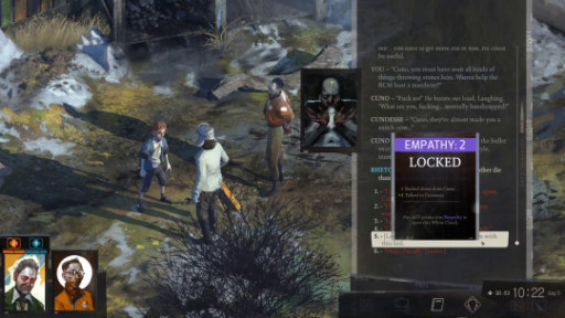 In-game events are resolved by rolling dice and comparing the result to the character’s skill level. Every check can either be active or passive. Passive checks run in the background, and successful rolls usually open new dialogue options. Active checks require you to roll the in-game dice yourself by picking a corresponding option.