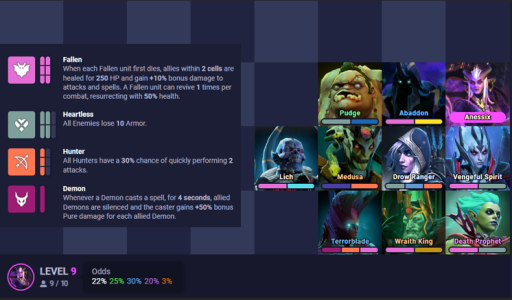 When going for a complete Fallen build, many players will go for the Hunter / Heartless variation to help them get through the rounds and eventually complete the 6 Fallen build. Picking up a Pudge will help with tanking and a Drow Ranger to add with the Hunters and Heartless. Not to mention, picking up those 2 units will eventually complete 4 Heartless when you get Death Prophet.