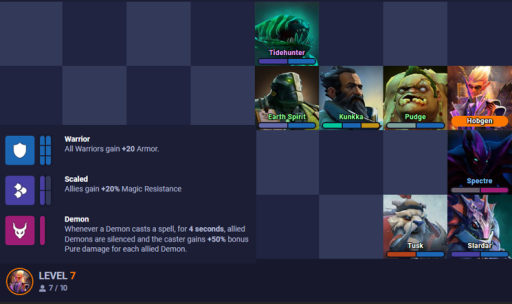 Get in a steady position with your interest until you can level up and roll for the Tidehunter at Level 6 or above. Once 6 Warriors get completed, it's best to go Level 7 to add the Spectre together with the 6 beefy boys. Spectre helps provide burst and damage with your team, so you won't heavily rely on Hobgen.