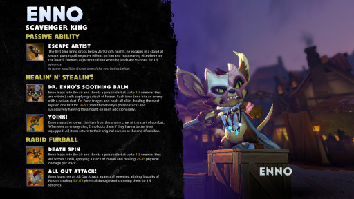 - Enno— a ranged menace, he leaps around the board, poisoning enemies and generally wreaking havoc