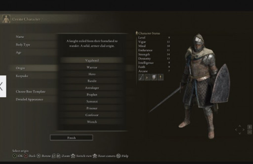 Vagabond is perfect for new players as it has a decent set of weapons and the most levels in vigor out of all the classes, with a great-looking armor set, and starting weapons consisting of the Halbert, Longsword, and Heater shield, the only downside is you’ll have to remove some of the armor or your Halbert to be able to medium roll because there’s nothing worse than fat rolling your way through a souls game.