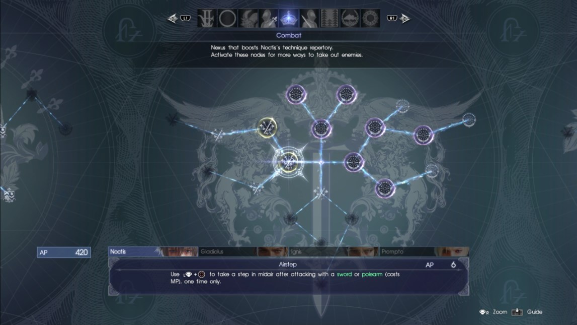 What is so unique about this node that it causes just 6 AP!? Well, it’s the classic airstep move. Ever since Final Fantasy XV decided to go the action route, the combat was revamped and this was a major addition. Call it a rite of passage for all action games.