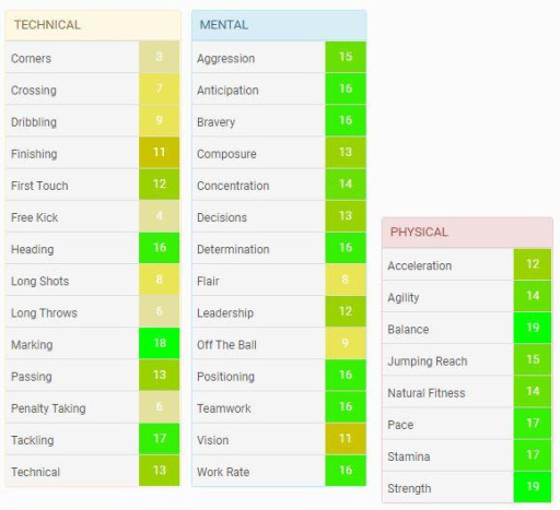 Despite his age, Chiellini is still a superb defender. A consummate pro, his stats are highlighted by 20 bravery, 18 positioning, 18 teamwork, and a massive 19 tackling. He still has 16 pace too, although his 10 acceleration does undo that somewhat.