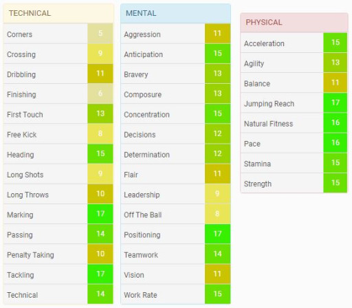 Despite his age, Chiellini is still a superb defender. A consummate pro, his stats are highlighted by 20 bravery, 18 positioning, 18 teamwork, and a massive 19 tackling. He still has 16 pace too, although his 10 acceleration does undo that somewhat.