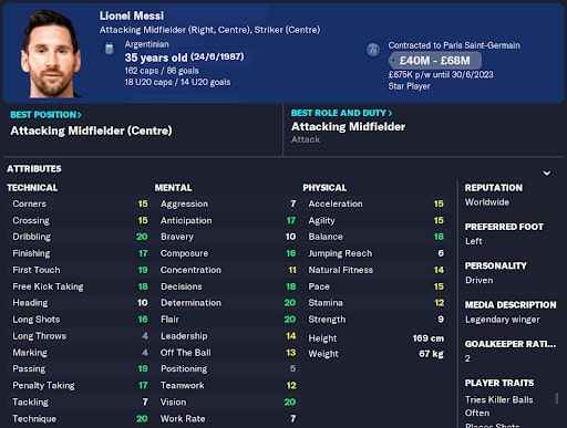 His stats are still unbelievable with multiple attributes being a 20; dribbling, technique, determination, flair and vision are all given the top mark. The Argentine’s finishing, passing, first touch and freekick taking are all magnificent making him a wonderful player to have and one that will score and create so many goals for your team.