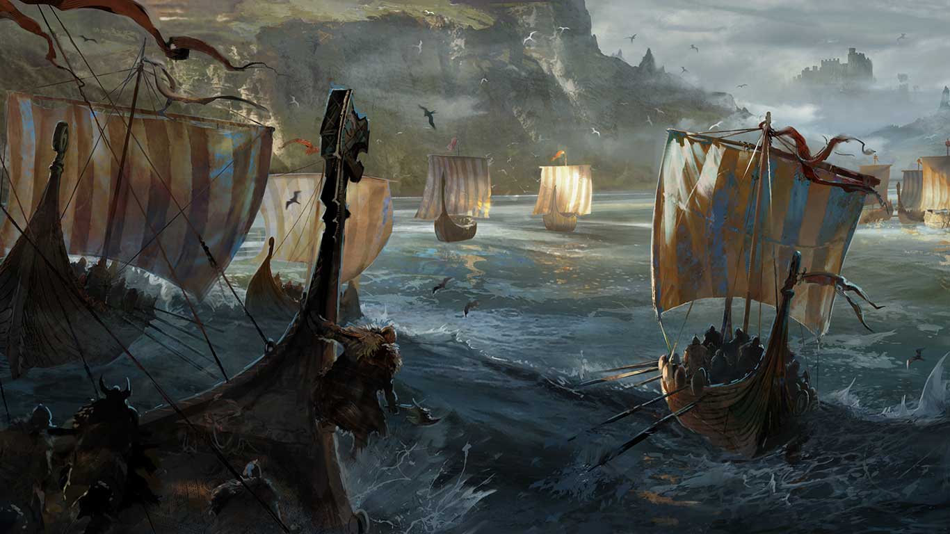 A Viking raid fleet sails over rough to their next target to loot and plunder