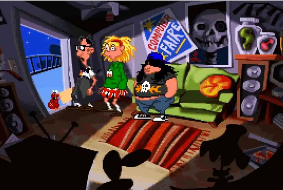 Original Day of the Tentacle graphics with (left to right) Bernard, Laverne, and Hoagie opening up the door to receive a letter from a hamster.