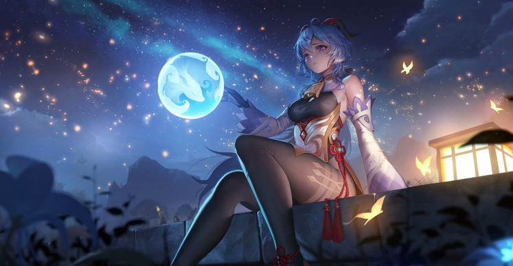 This background is very beautiful. We can see Ganyu in the middle of the night with her Elemental Burst and some butterflies around her.