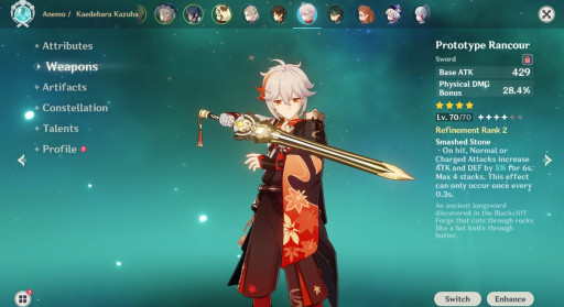 - Prototype Rancour is a craftable 4-star weapon that boosts Kazuha’s Physical DMG Bonus while also boosting his overall ATK and DEF stat, making it a very good weapon for this Kazuha build. The best part about it is that getting this weapon won’t involve the Wish (gacha) system! Very F2P-friendly indeed.