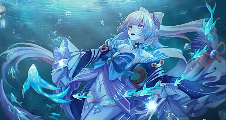 Here we can see Kokomi under the water with some fish and jellyfishes around her. Since she looks like a mermaid and she’s a Hydro character, water and fishes are very common elements in her fanarts.