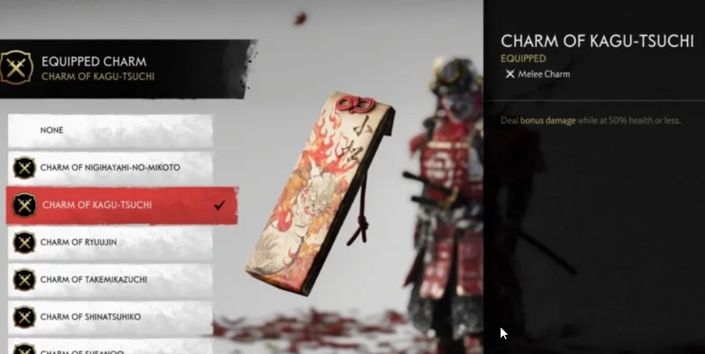 This charm is also great for long battles and combat focused playstyles. The Charm of Kagu-Tsuchi grants Jin the ability to inflict bonus damage once his health falls below 50%. This charm is very useful for turning the tide of combat, especially when the fight is going south fast. With this charm equipped, even if you go down, you would be sure to take as many Mongols as you can with you.