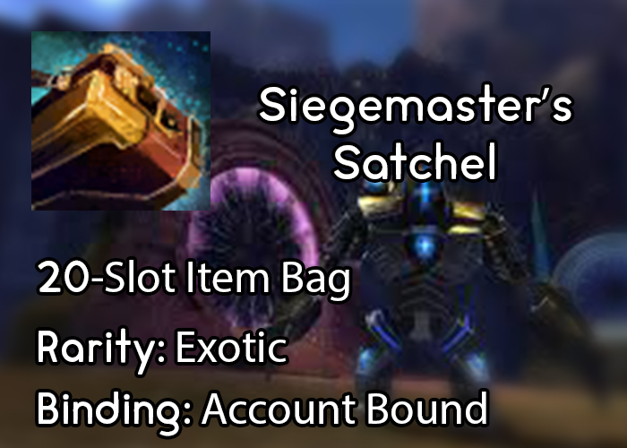 The Siegemaster’s Satchel is a handy little item bag that can keep your consumables like your Food and Utility items safe from being moved around your inventory. Siege blueprints can be held in these bags and can provide players with the means to help their commanders. These bags are a good option for scouts in World versus World looking to do some recon and placing blueprints ahead of the main zergs.
