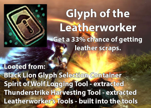 - Players that don’t want to buy leather from the Trading Post can choose to use this Glyph while they are roaming around Tyria collecting resources and earn their leather passively.
