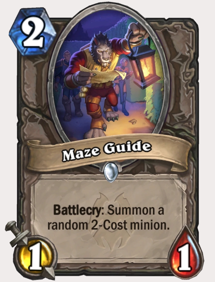 A popular 2 drop in Arena, Maze Guide causes either frustration from summoning a 1/1 minion or great elation from summoning unexpected highrolls like Pyros.