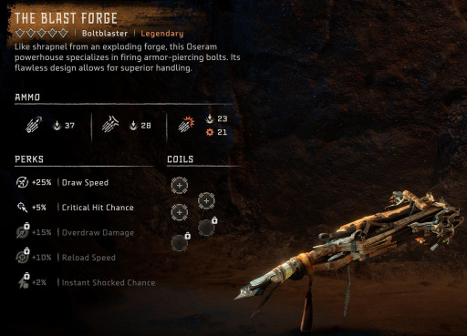 The Blast Forge is a Boltblaster and arguably the best weapon in the game. It’s essentially a burst gatting gun (but if you use your weapon skill it can turn into a Gatling gun). This Boltcaster offers Piercing bolts, advanced bolts and explosive bolts – they are mostly just damaging bolts but once fully upgraded and properly coiled up, this boltblaster just does so much pure damage it destroys everything. The Blast Forge is a damage monster and probably the best weapon in the game in terms of DPS!