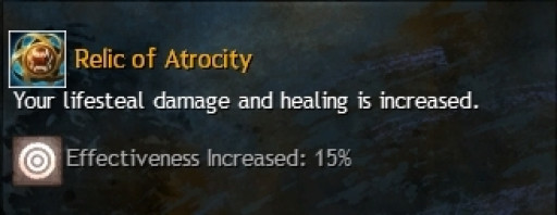 With Relic of Atrocity equipped, the damage and healing of your lifesteal attacks and effects are increased by 15%.