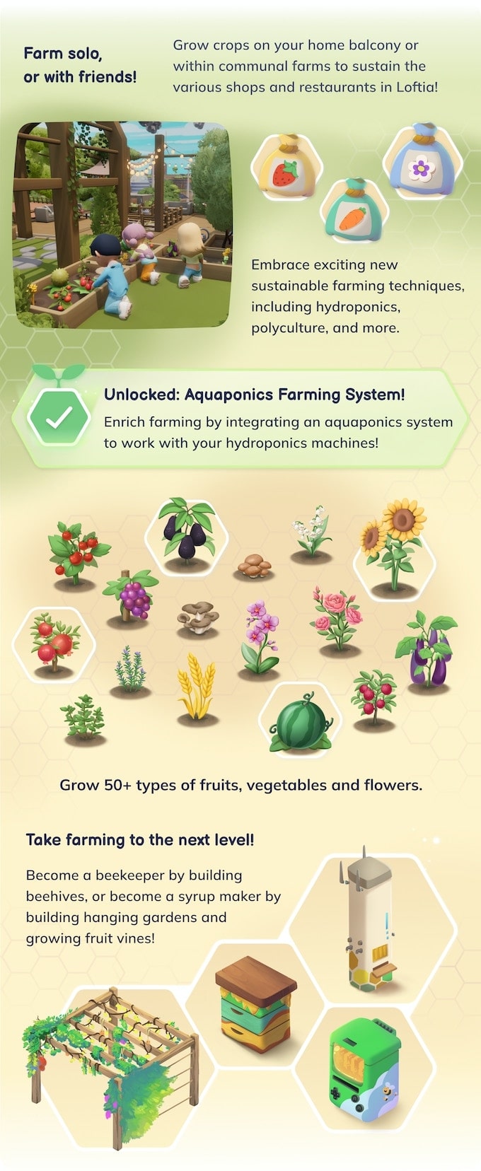 You’ll have your personal farm, which your friends can also help in decorating, as well as the community farm in the city. Additionally, while Loftia will still have traditional farming, you also get to plant right on your balcony and get to learn hydroponics. You get to monitor pH levels, nutrients, water, and temperature. Different crops have different needs, so it is up you to experiment and take note of it. Other concepts that the game will touch on are polyculture, and aquaponics.