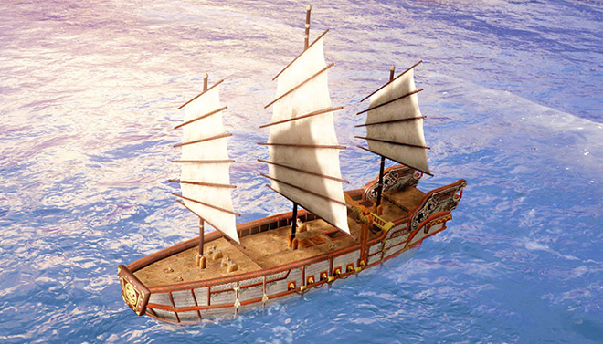 Eurus is a compact steamer designed for speed. It takes quite a long time to obtain Eurus, but when you do, it will help you reach your destinations much faster. She has one of the lowest durability values in the game, at 3,100, and is especially vulnerable to Dead Waters, but she more than makes up for it with her superior sailing speed and resistance to Kelp Beds. The crew for Eurus is not that hard to get, and most Dead Waters can be easily maneuvered around.