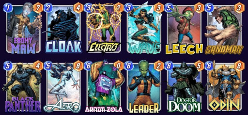 You have a lot of powerful 6-cost cards in this deck that work well together. Electro makes it possible to play out two 6-cost cards on turns 5 and 6, while your opponent will probably be heavily impaired by the 1-card-per-turn rule that Sandman will create. Playing Leech early in the game, makes Leader a great play for the last turn. Doctor Doom and Odin can swarm your entire board with DoomBoots and Arnim Zola works great with Black Panther, and Doctor Doom.