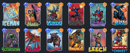 This deck also features Lockjaw which can make a huge difference if it pulls a card like Leech, America Chavez or Hobgoblin out of your deck. The way to play this deck is by playing your weak cards at the start of the game like Iceman, Mantis, Youndu and Scorpion and then taking them back to your hand with Falcon and Beast to get to use their effects multiple times. It’s not a strong deck by itself, but it will probably make the opponent’s deck unplayable which is all you need to win some easy cubes.