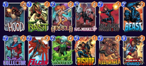 Falcon and Beast are your cards that can bring cards from the field back to your hand. You’re going to want to use them to bring back key cards with good On Reveal effects, that you can activate multiple times per game and disrupt your opponent with them. Bast is a really good card in this deck, since there aren’t any cards, besides America Chavez and Mysterio that have more than 3 power, but even then, using Bast with Mysterio in hand is a good choice, since all 3 copies of Mysterio will have 3 power once you play them. This really makes a big difference in power when used on cards like Bishop and Angela who will start at 3 power and then become significantly more powerful as the game goes on. You can use Falcon and Beast to bring back useful cards like The Hood, Bast, Hitmonkey and Black Widow and then play them all out again on the last turn for a big swing in power.