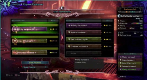 - Upgrade attack, defense, status effects, elemental damage, or sharpness.