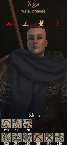 Liena is a member of the dey Tihr family of the Kingdom of Vlandia, and has a reputation for being gallant. She’s a jack of all trades with a slight focus on combat skills over non-combat skills.