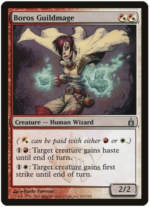 Fueled by fire and industry, the red-white color pair Boros is all about attacking. It’s a creature-focused color pairing that wants to attack early and often. The featured card, Boros Guildmage, helps creatures do just that by allowing them to attack right away and with an advantage.