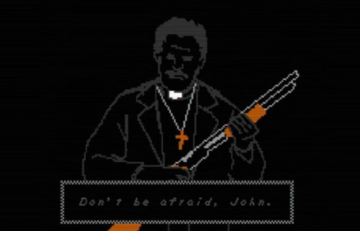 Father Garcia brandishes a shotgun as he speaks to protagonist John Ward. Gotta admit, not afraid right now. But, not of the demons.