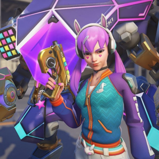 The skin is primarily purple with blue accents throughout. D.Va herself also has a mainly purple look with some blue in there as well. Unlike her normal appearance, she has two purple pigtails and a headset with bunny ears on it. Seeing as she always uses the voice line "bunny hop," this headset is very appropriate.