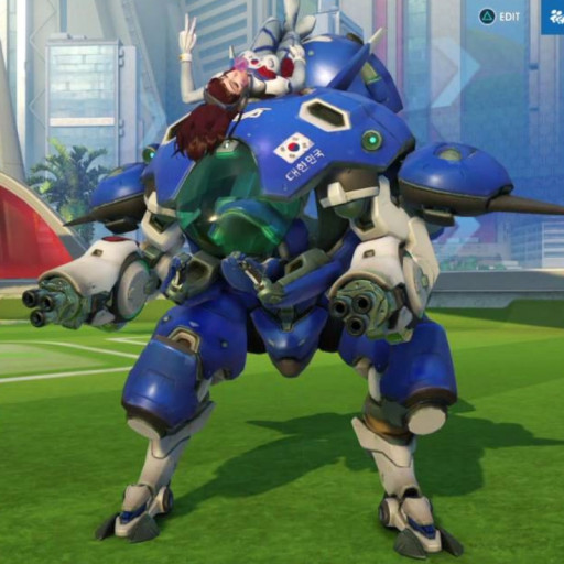The South Korean flag is known as Taegeukgi (Hangul: 태극기). The skin brings the South Korean flag to life by having the blue, white, and red mesh together to form a pleasing color palette representing D.Va’s home country. To top it all off, there are little details on the mech, like the "대한민국" Hangul on the top, which means South Korea in Korean.