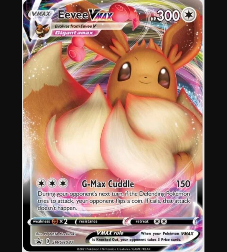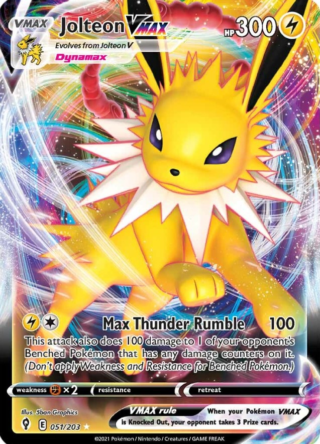 Now Jolteon VMAX is similar to its psychic counterpart, but is more definite on how much damage it can dish out. With a guaranteed 100 damage to the active pokemon as well as one of your opponent’s benched, this eeveelution is a beast. It’s no surprise many of the eeveelutions are sought after. Gorgeous design and deadly execution.