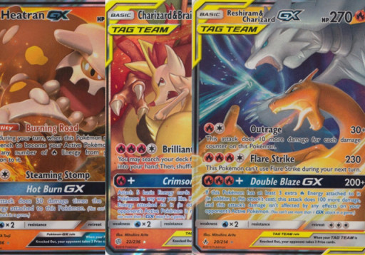 Heatran GX from Unified Minds, Charizard & Braixen GX from Cosmic Eclipse, and Reshiram & Charizard GX from Unbroken Bonds.