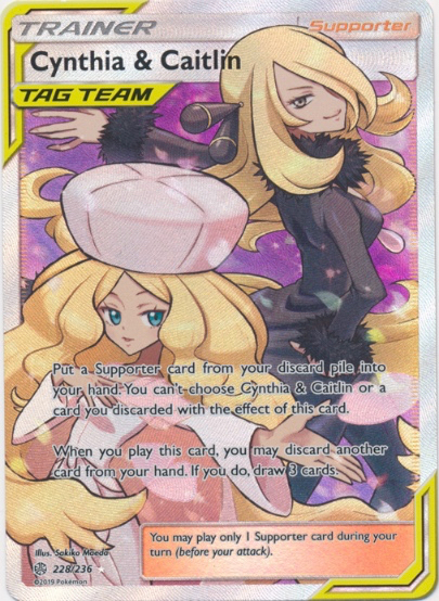 This is one of the unique Tag Team Supporter cards. Cynthia & Caitlin puts a Supporter card from your discard pile into your hand. You may also discard a card from your hand to draw three cards. Draw support + retrieval = good all around card.