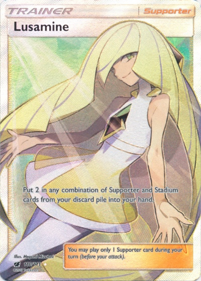 Lusamine puts two in any combination of Supporter and Stadium cards from your discard pile into your hand. This Supporter card was briefly banned from the Expanded format because playing two in a deck can allow you to never run out of cards. It has since been unbanned and we are free to play it to our heart’s content. Stall decks everywhere thank you.