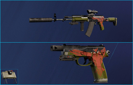 1. AK-12 with Magnified B Scope, Flash Hider, Vertical Grip, and Laser + P9 with Suppressor and Laser + Claymore