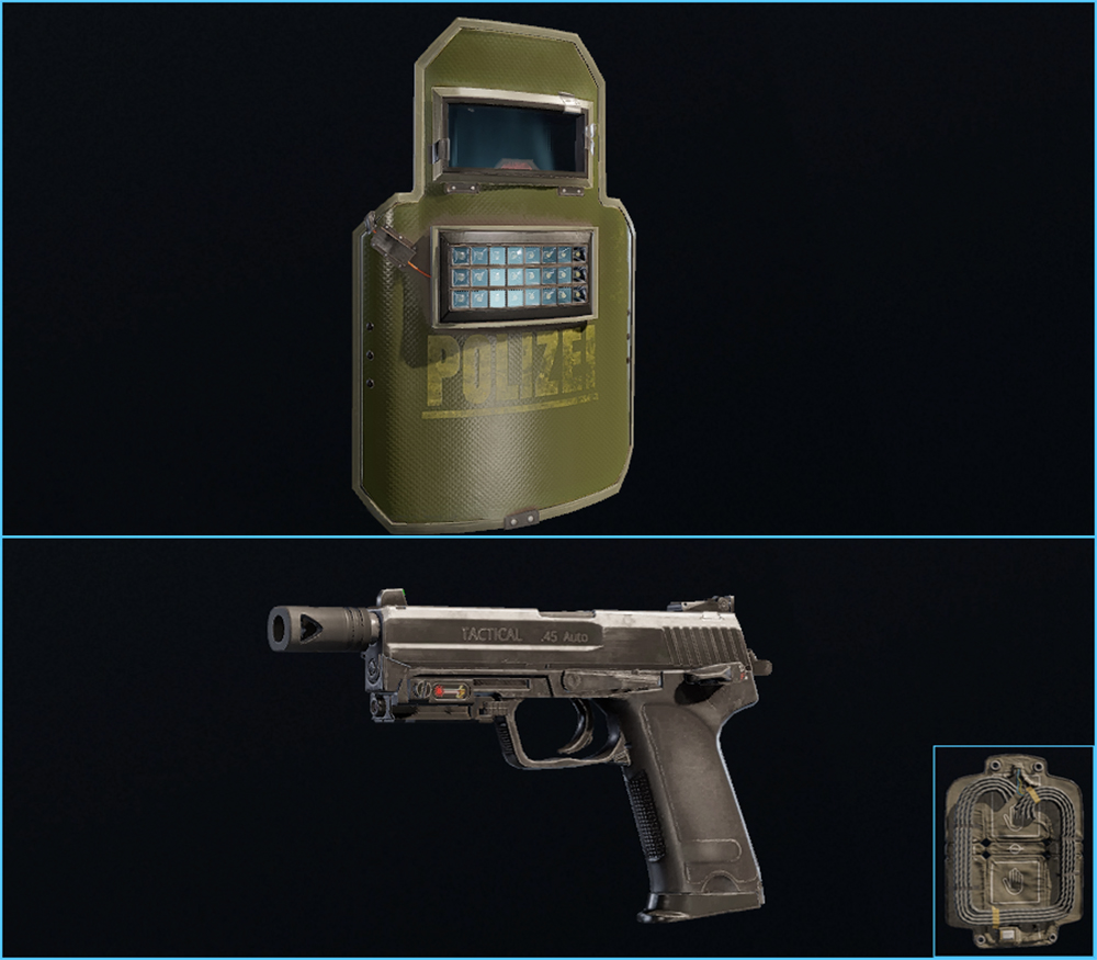 1. G52-Tactical Shield + P12 with Muzzle Brake and Laser + Breach Charge