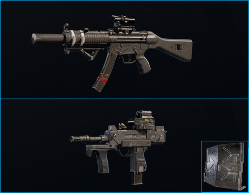 5. MP5SD with 1.5x Scope, Angled Grip, and Laser + Bearing 9 with Holographic, Flash Hider, and Laser + Deployable Shield